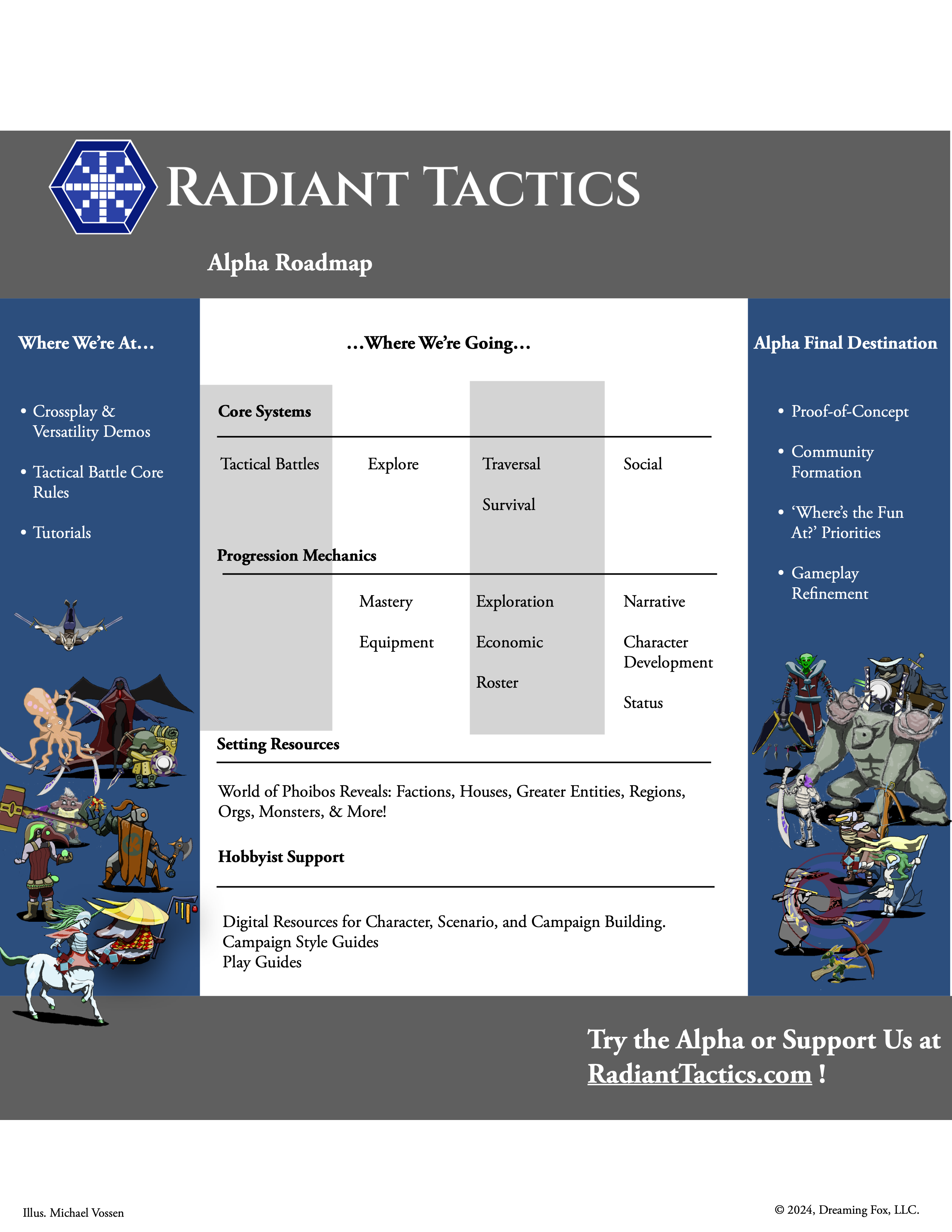 Radiant Tactics makes all the genre’s best styles crossplayable and hobbyist craftable. It’s an interoperable TTRPG system, set in the World of Phoibos.
