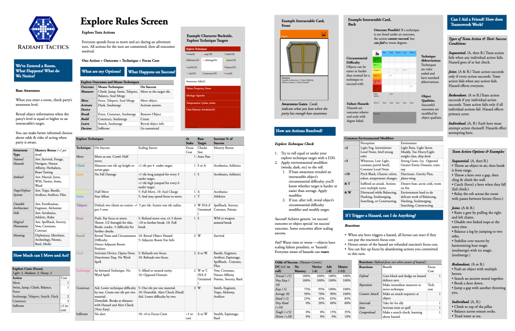 Radiant Tactics’ exploration rules are designed to let any unit make perform techniques, allowing them to participate in dungeon puzzles & wilderness encounters. This means your Radiant CCG duel cards, wargame models, one-off adventure units — all can play & progress in traditional TTRPG style play.