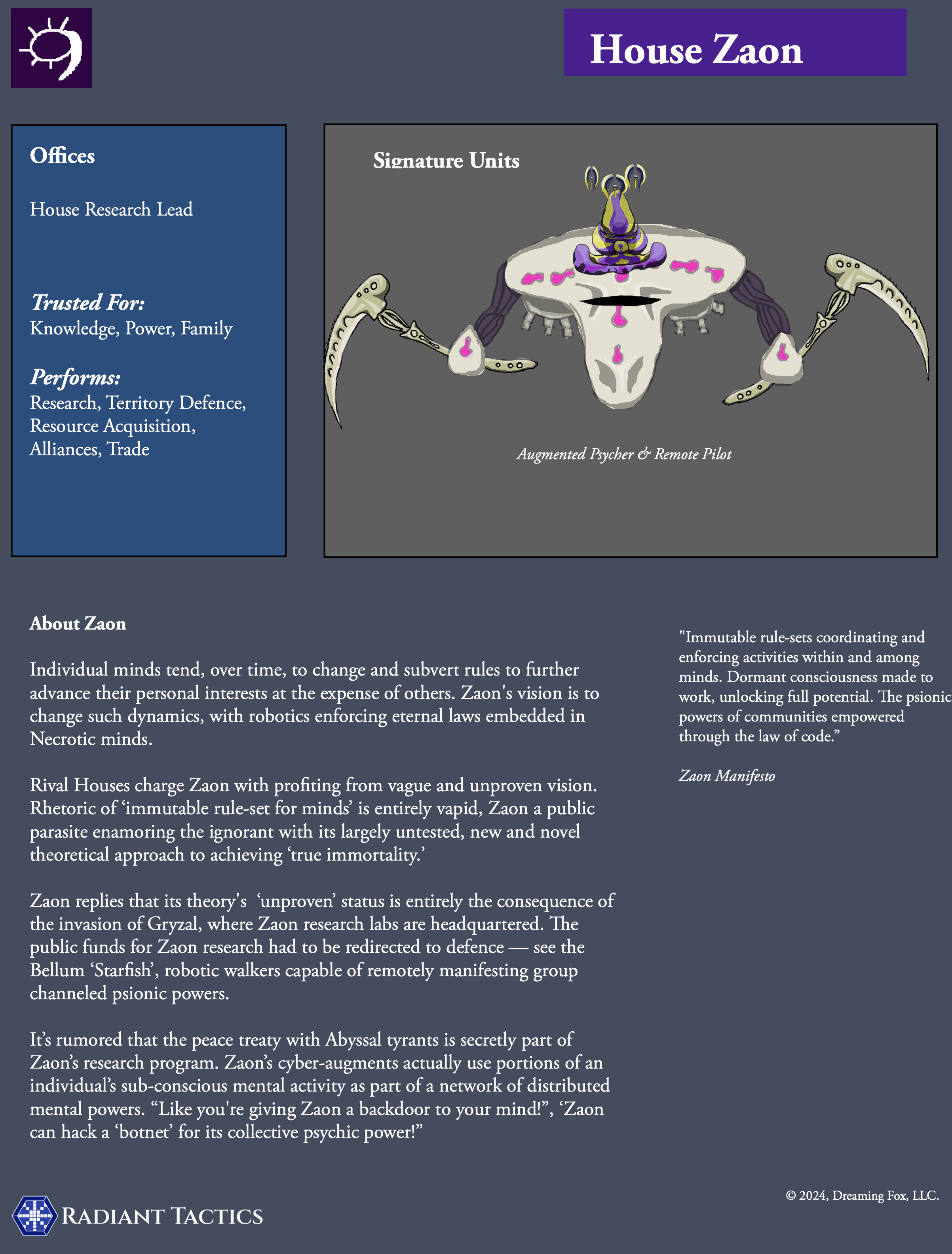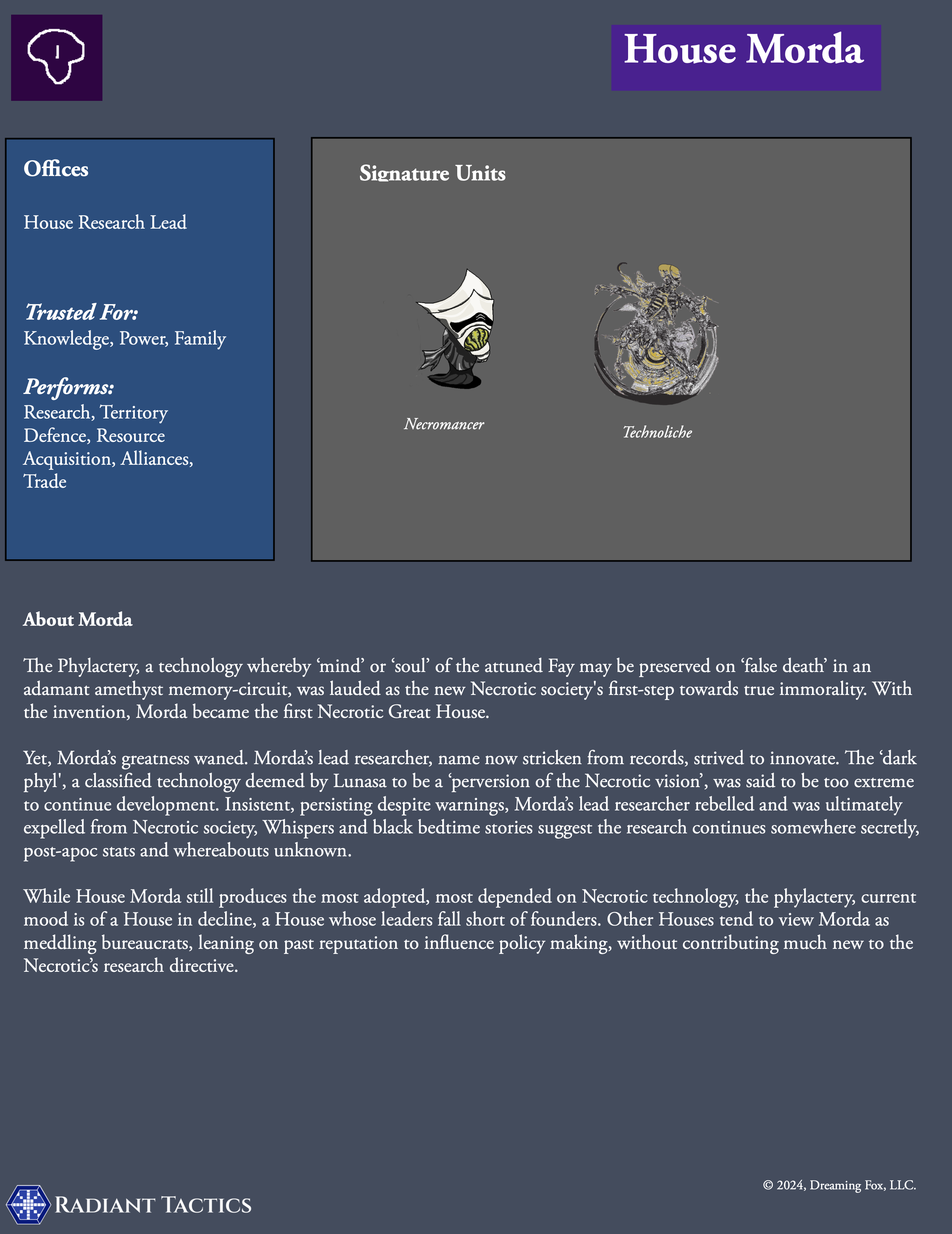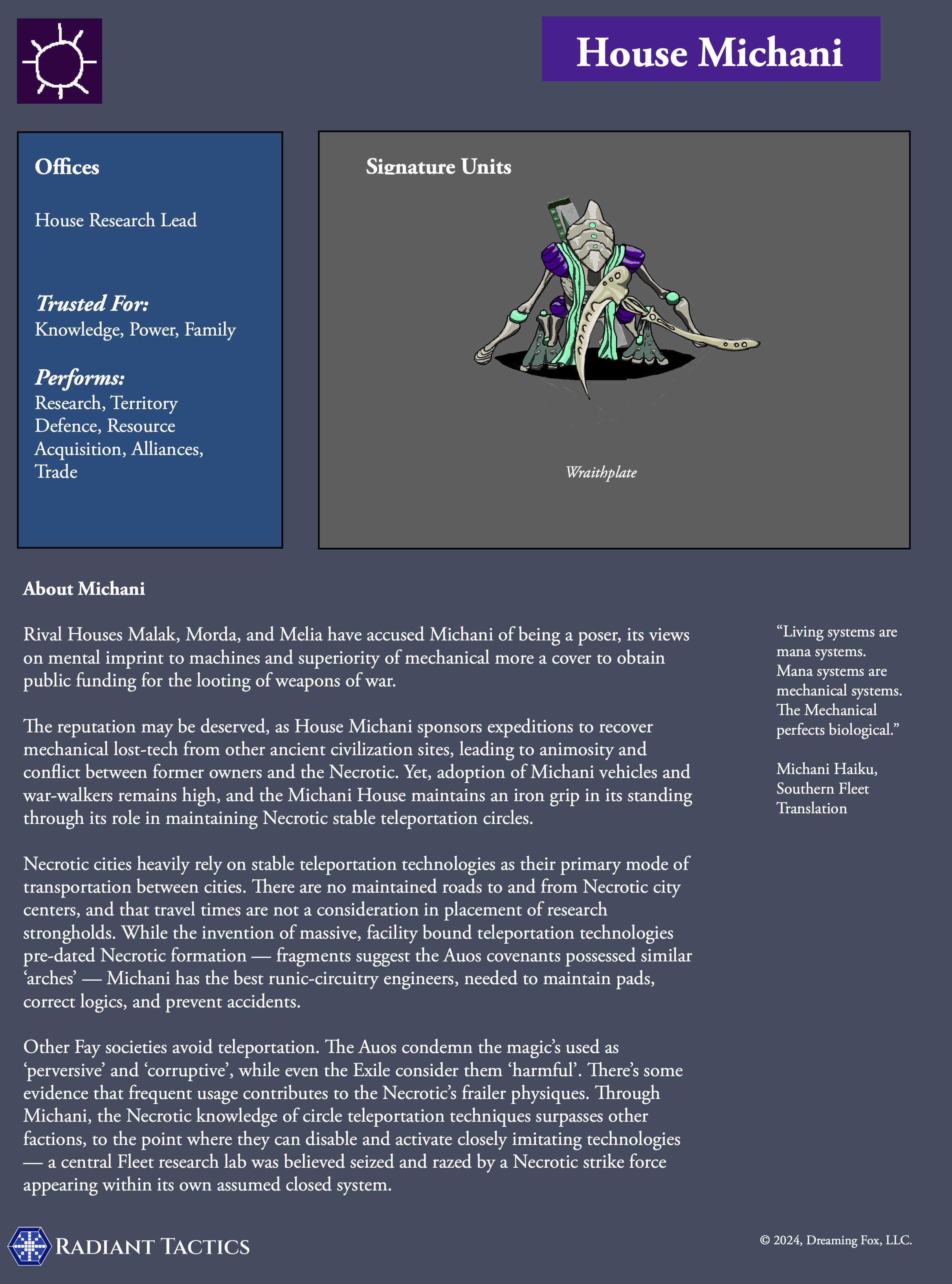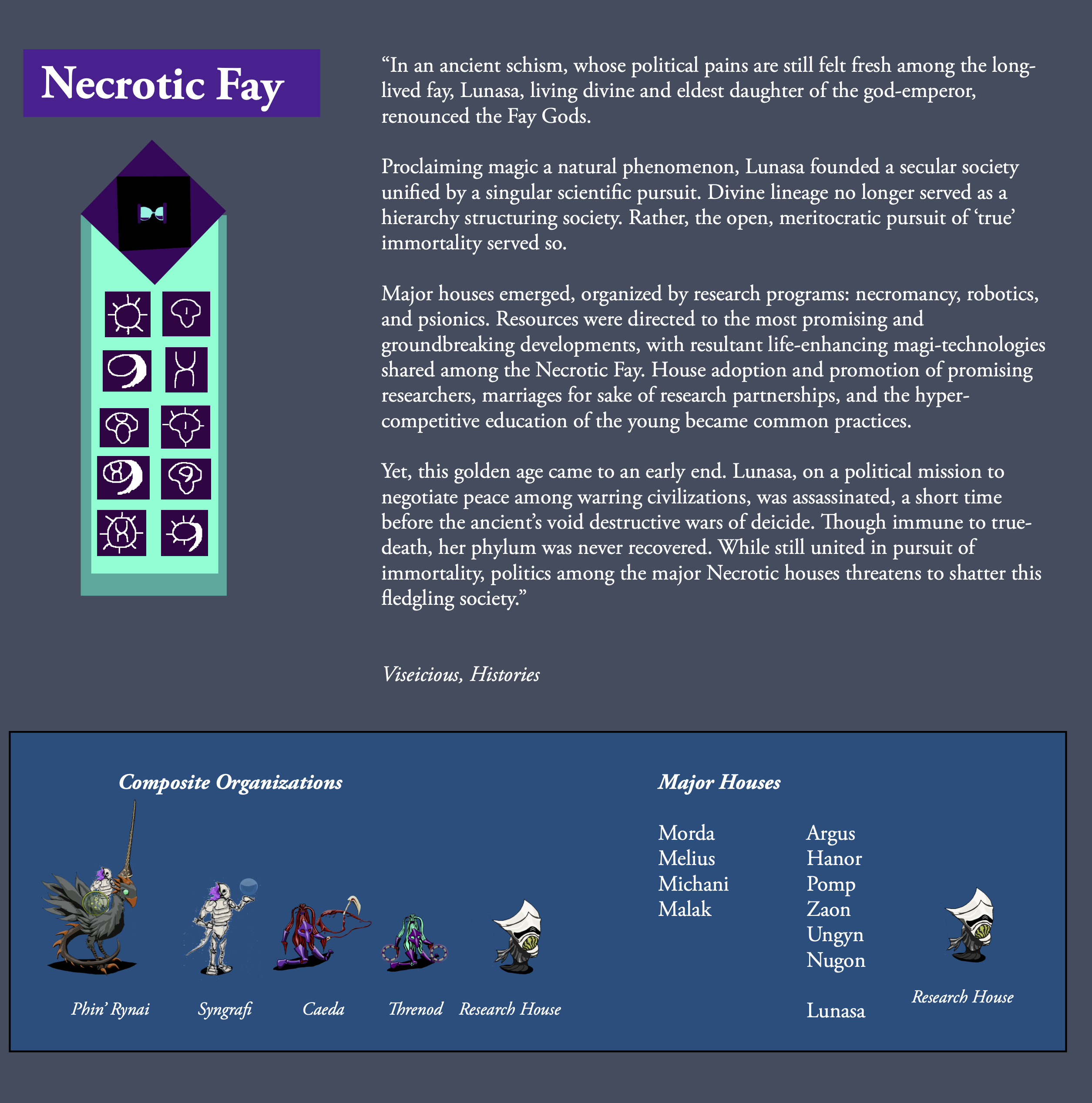 “The Necrotic’s great houses walk a line between publicly adhering to Lunasa’s vision, and privately securing every advantage they can for their research line. Categorization of research and technologies as ‘critical to true immortality’ is a major political issue. On the one hand, critical research tasks receive the majority share of pooled resources. On the other hand, critical research is made open access — otherwise ‘secret’ findings, techniques, and methods are shared with competitors. Anyone dealing with Fay great houses would be prudent to invest in premium deep dives on house rivalries…”