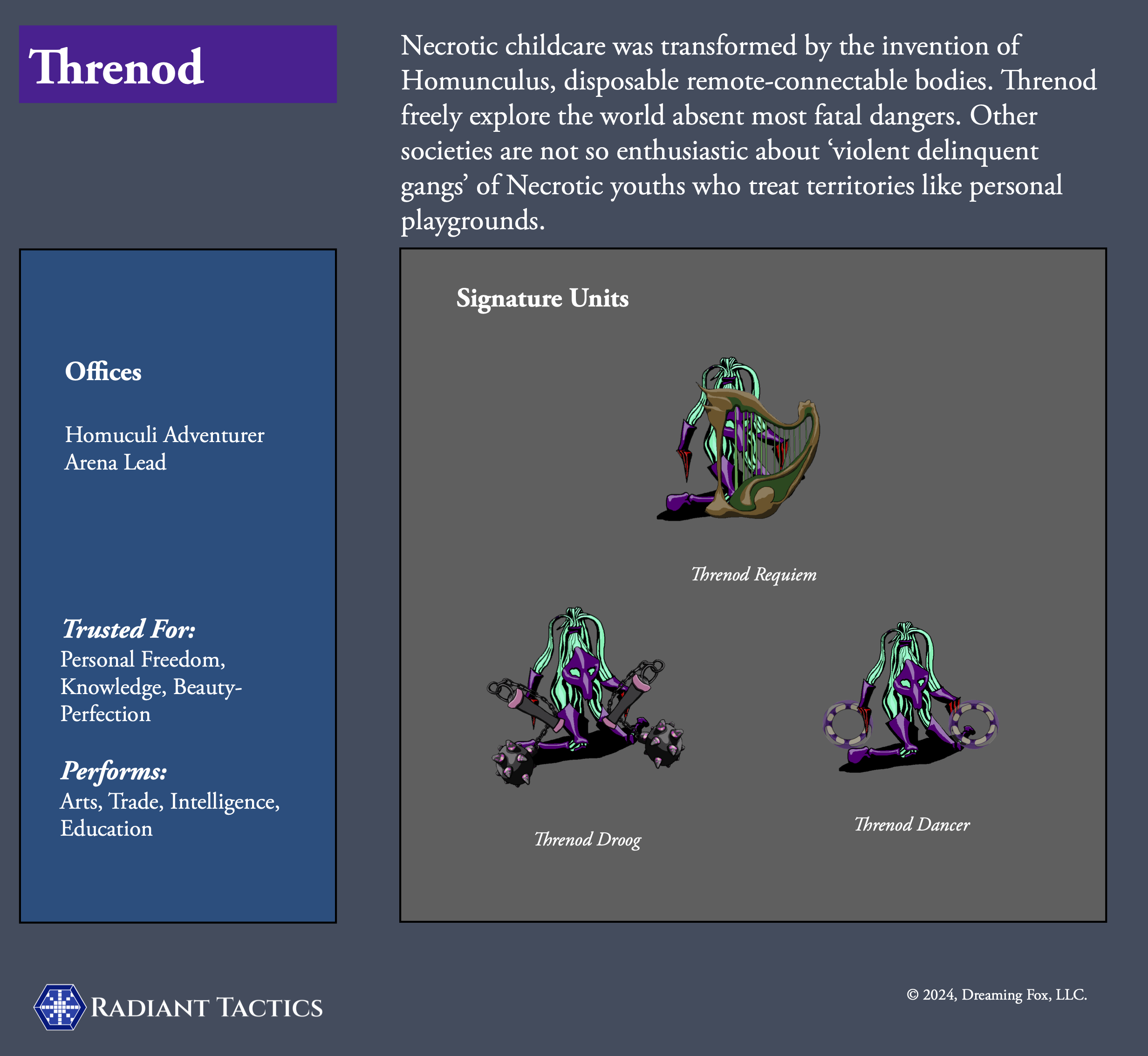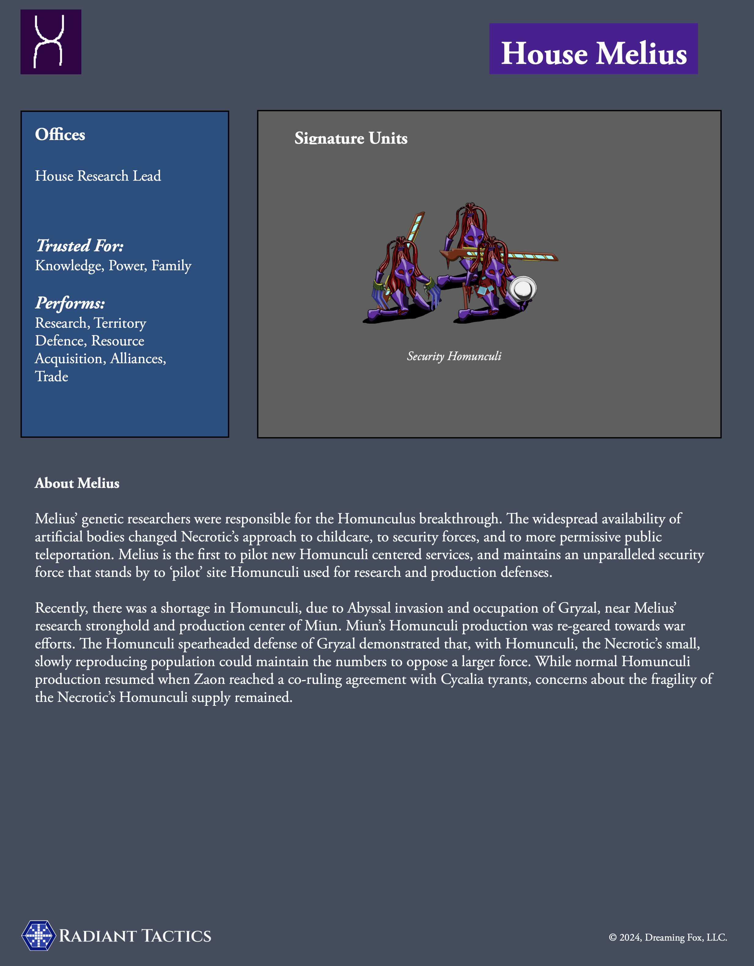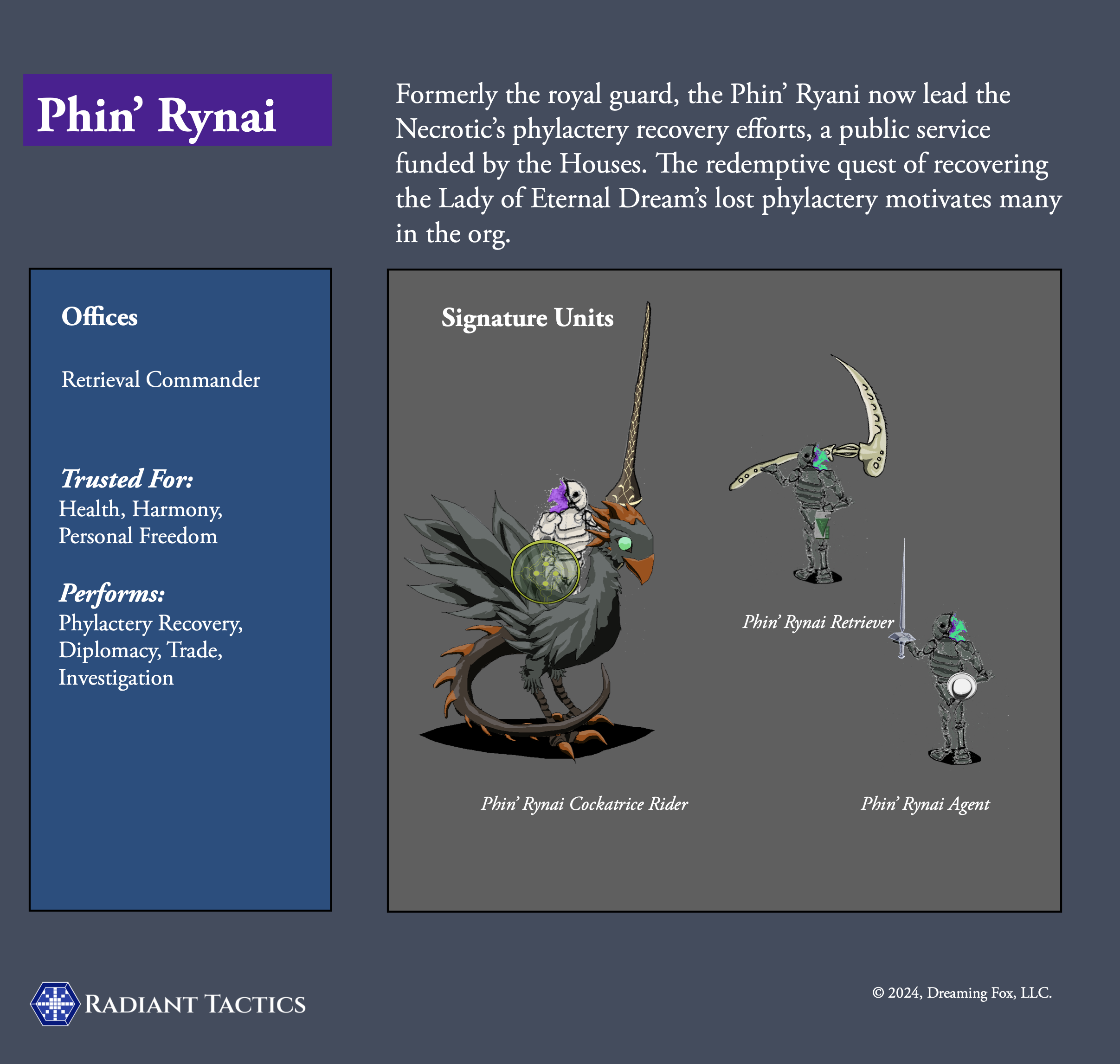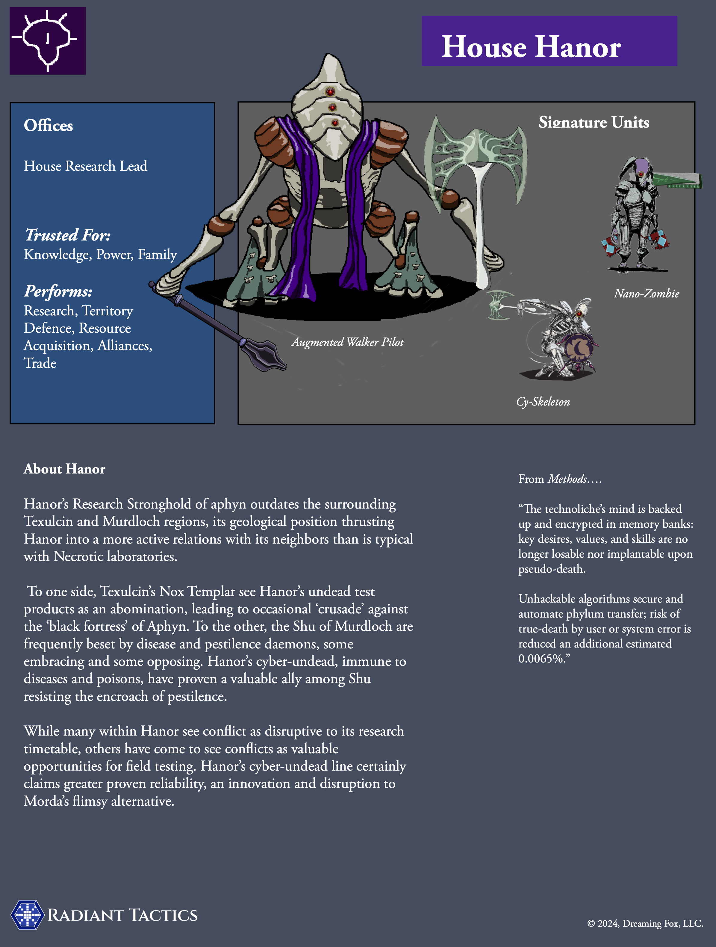 “The Necrotic’s great houses walk a line between publicly adhering to Lunasa’s vision, and privately securing every advantage they can for their research line. Categorization of research and technologies as ‘critical to true immortality’ is a major political issue. On the one hand, critical research tasks receive the majority share of pooled resources. On the other hand, critical research is made open access — otherwise ‘secret’ findings, techniques, and methods are shared with competitors. Anyone dealing with Fay great houses would be prudent to invest in premium deep dives on house rivalries…”