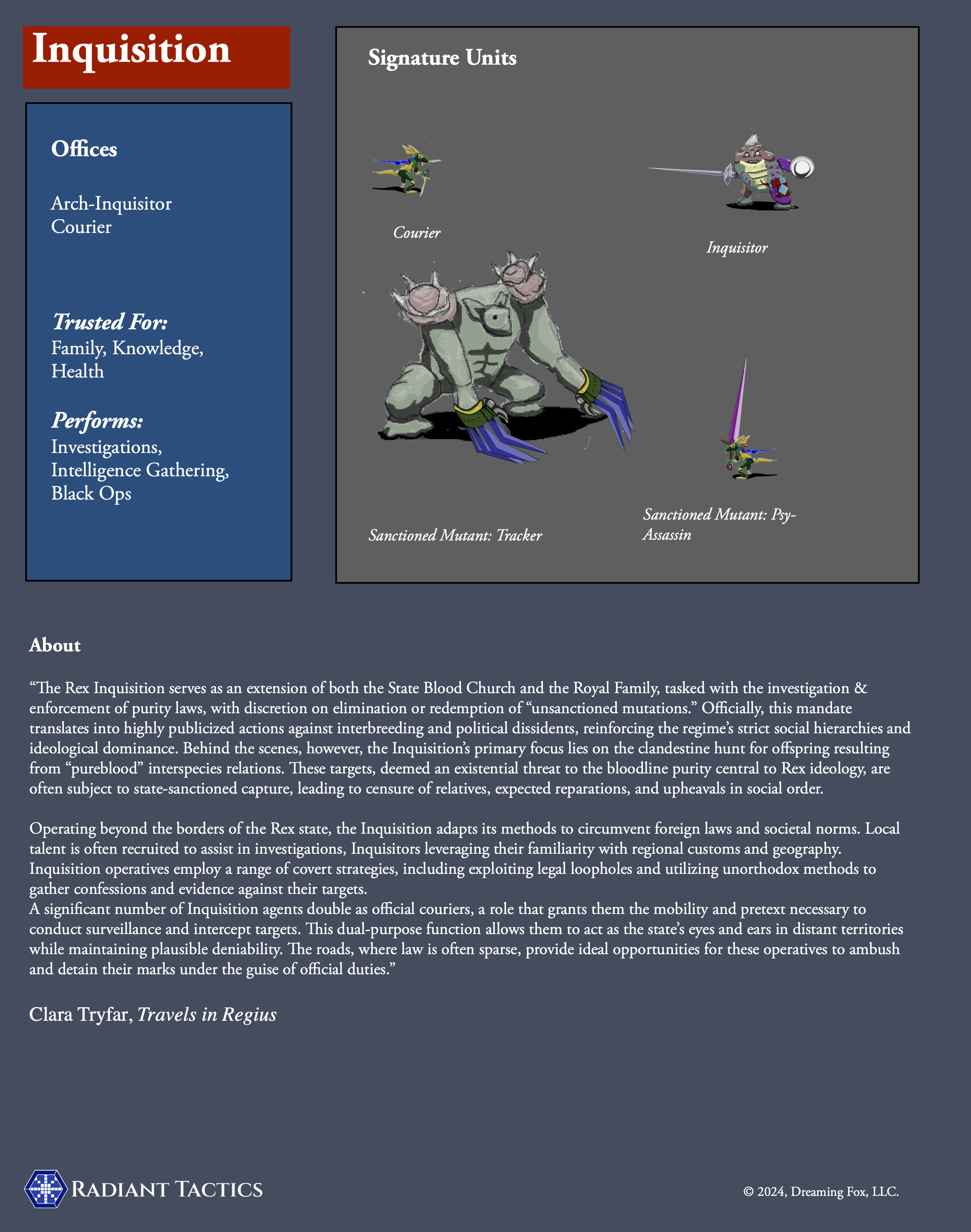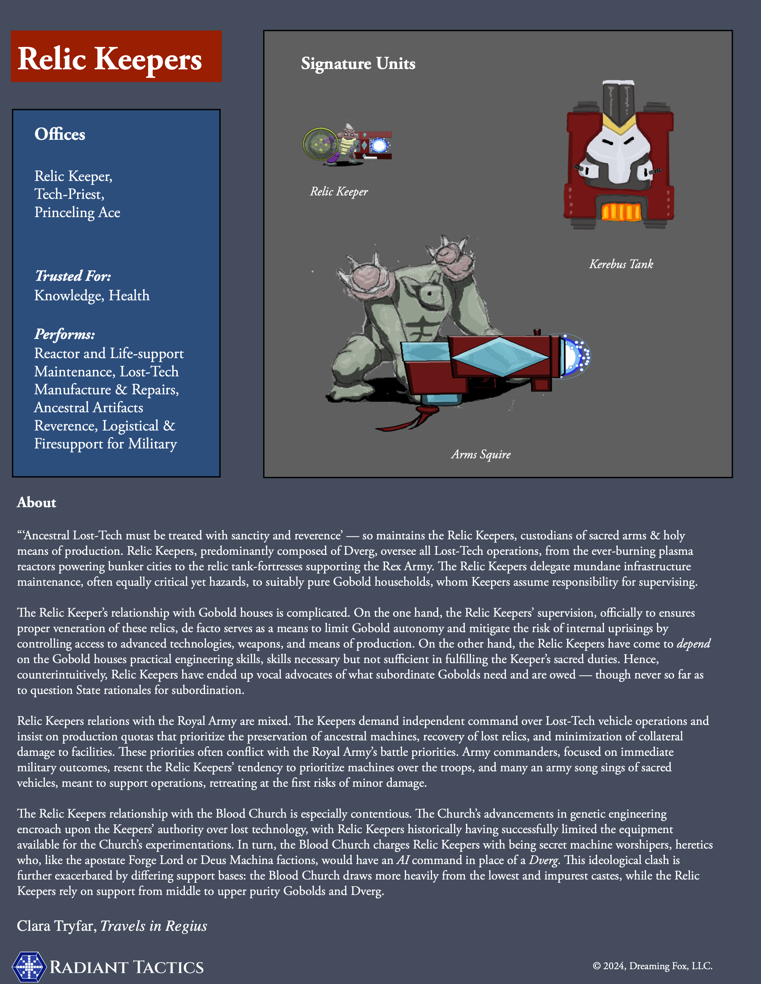 Vast, and self-contained, urban centers designed for prolonged periods of isolation, the Dverg bunker cities derive their self-sufficiency and endurance from lostech plasma reactors, relics of an advanced technological era that provide immense and renewable energy reserves. This allows these cities to thrive in isolation for extended durations, minimizing the need for external interaction. However, when direct relations become necessary, the Rex peoples rely on Overgoer caravans to traverse the fragmented transportation network. These caravans serve as vital links for fostering intercity communication, commerce, and diplomacy.